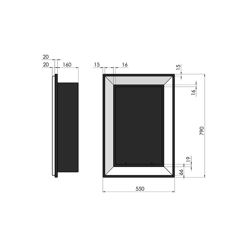 Wymiary: wysokość 790 mm, szerokość 550 mm, głębokość wnęki 160 mm. Waga 11 kg.