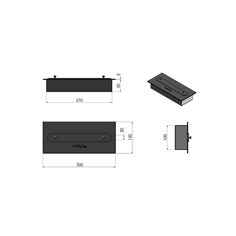 Biokominek pionowy, wiszący, rama frontowa i korpus wykonane ze stali lakierowanej farbą termoodporną w kolorze czarny mat. Na odwrocie biokominka umieszczono specjalne otwory do zawieszenia na ścianie lub zabudowania. W zestawie są kołki rozporowe umożliwiające zawieszenie biokominka.
