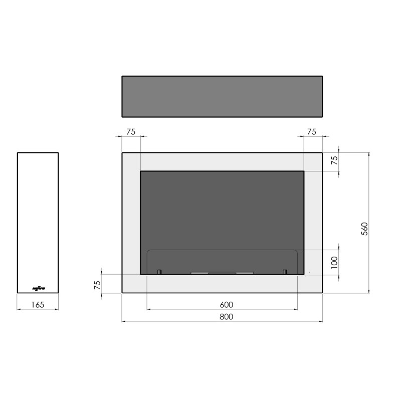 Biokominek poziomy, wiszący, wykonany ze stali o grubości 1,5 mm lakierowanej farbą termoodporną w kolorze czarny półmat strukturalny. Wnęka biokominka lakierowana w kolorze czarny mat strukturalny.
