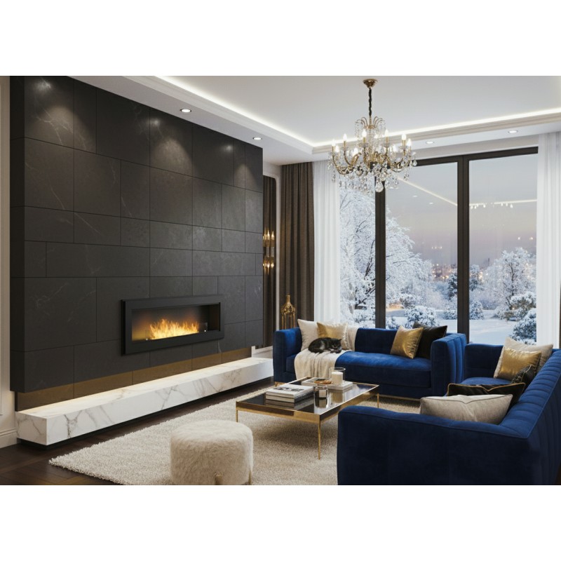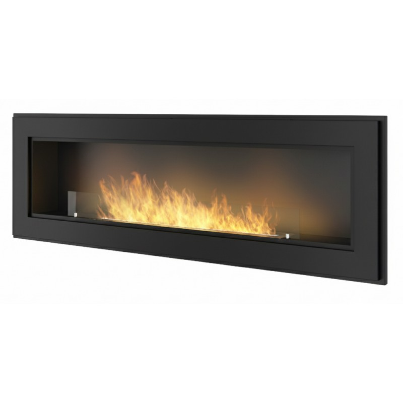 Panoramiczny biokominek z czarną MATOWĄ ramą 150cm i szeroką linia ognia z szybą