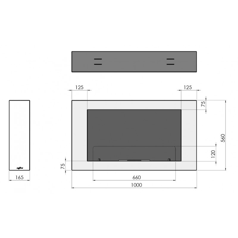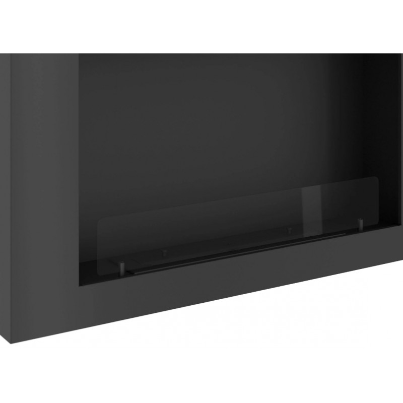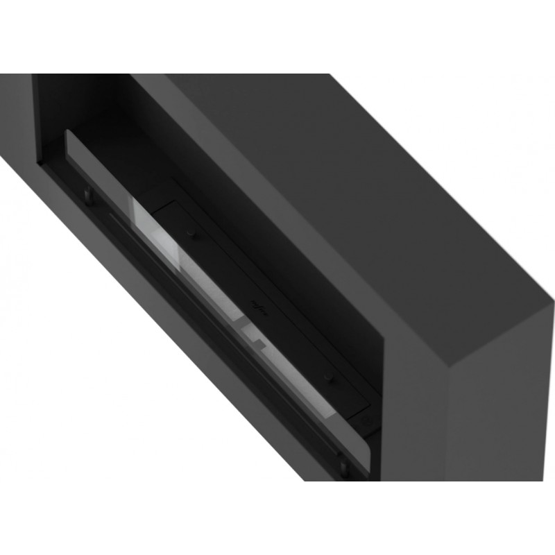 Biokominek poziomy, wiszący, wykonany ze stali o grubości 1,5 mm lakierowanej farbą termodorporną w kolorze czarny półmat strukturalny. Wnęka biokominka lakierowana w kolorze czarny mat strukturalny.