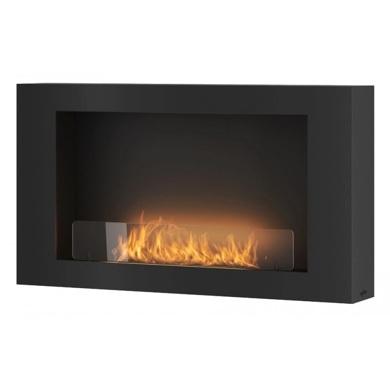 Naścienny biokominek Murall czarny z szeroką linią ognia. Wiszący biokominek polskiej produkcji z bezpiecznym palnikiem.